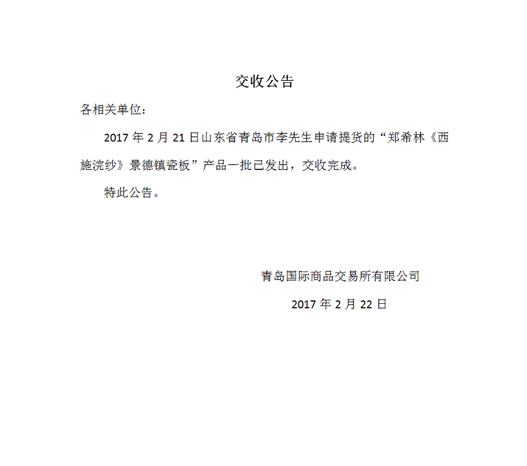 2017年2月21日山东省青岛市李先生申请提货的“郑希林《西施浣纱》景德镇瓷板”产品一批
