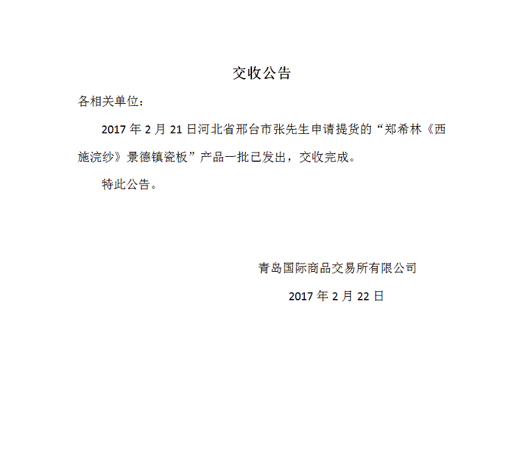 2017年2月21日河北省邢台市张先生申请提货的“郑希林《西施浣纱》景德镇瓷板”产品一批