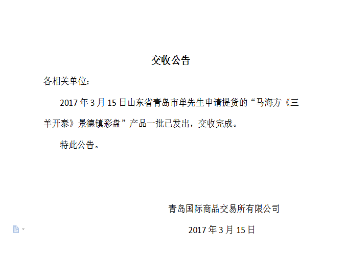 2017年3月15日山东省青岛市单先生申请提货的“马海方《三羊开泰》景德镇彩盘”产品一批