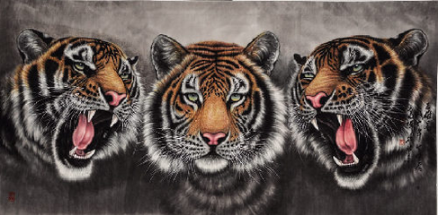 虎被人们称为百兽之王,他凶猛威武,是历代画家们的宠儿。自古便有很多以虎开头的成语:虎斗龙争、虎踞龙盘、虎狼之势、虎略龙韬、虎落平川、虎生三子,必有一彪、虎视眈眈、虎体熊腰、虎头虎脑、虎啸风生、虎穴龙潭等等,老虎拥有这勇气和胆魄与一身,代表着权利与荣耀,象征能压倒、征服一切,人们给予了中国画虎非常高的地位,它总是以一种正义、威严的身份被诗人传诵。在国画当中下山虎最为常见,有寓意人年学成归来,年轻有为、大展宏图的说法,上山虎则指步步高升、前途无阻。