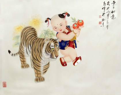 高伟《事事如意》国画花鸟艺术品,画家在作品中描绘了一只老虎形象,通过独特的视角将老虎的威猛气质描绘出来,尤其是对老虎的花纹身姿及侧脸的描绘,形神并至,笔境兼夺,一个可爱的小孩手里拿着柿子,栩栩如生,寓意着事事如意,具有很强的艺术观赏性。