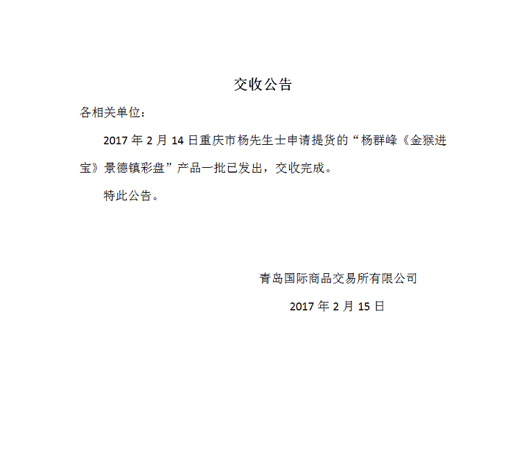 2017年2月14日重庆市杨先生申请提货“杨群峰《金猴进宝》景德镇彩盘”产品一批