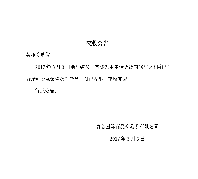 2017年3月3日浙江省义乌市陈先生申请提货的“《牛之和-祥牛奔瑞》景德镇瓷板”产品一批