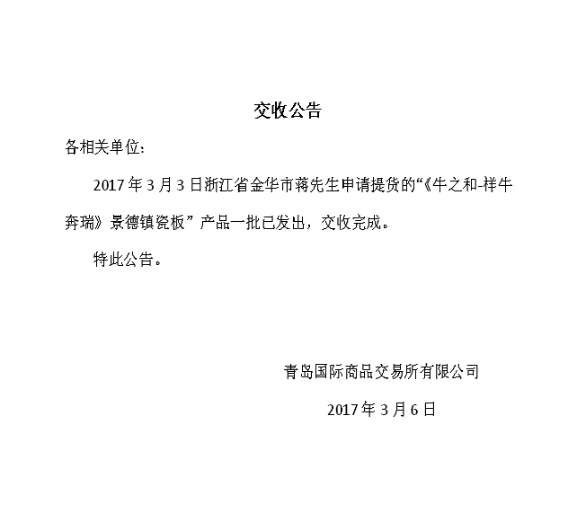 2017年3月3日浙江省金华市蒋先生申请提货的“《牛之和-祥牛奔瑞》景德镇瓷板”产品一批