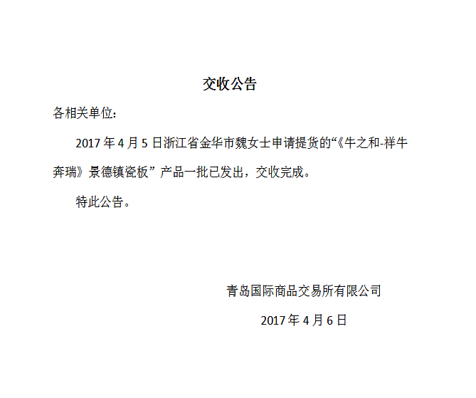 2017年4月5日浙江省金华市魏女士申请提货的“《牛之和-祥牛奔瑞》景德镇瓷板”产品一批
