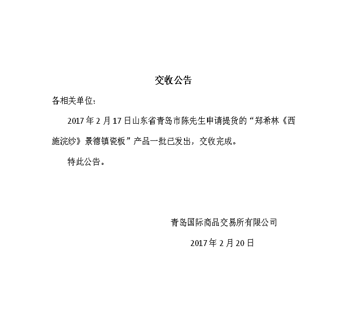 2017年2月17日山东省青岛市陈先生申请提货的“郑希林《西施浣纱》景德镇瓷板”产品一批