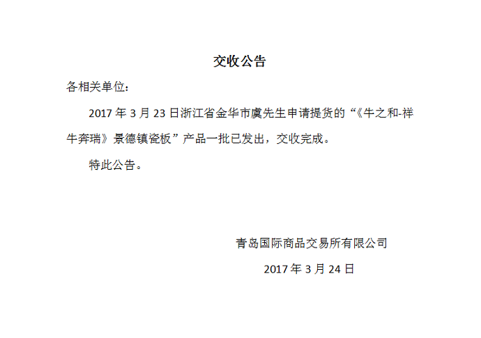 2017年3月23日浙江省金华市虞先生申请提货的“《牛之和-祥牛奔瑞》景德镇瓷板”产品一批
