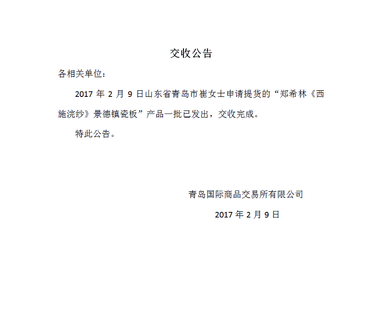 2017年2月9日山东省青岛市崔女士申请提货“郑希林《西施浣纱》景德镇瓷板”产品一批