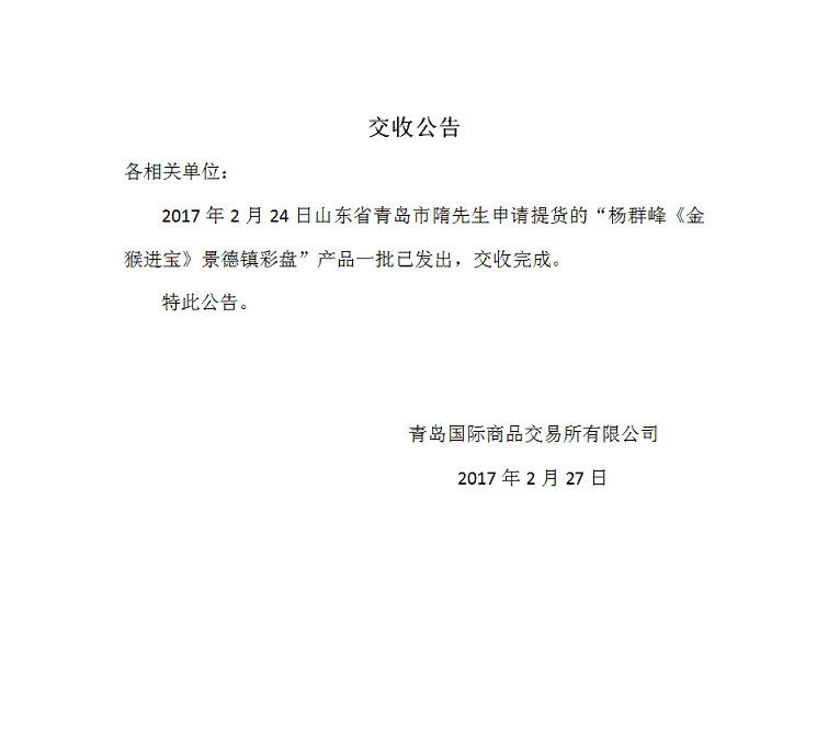 2017年2月24日山东省青岛市隋先生申请提货的“杨群峰《金猴进宝》景德镇彩盘”产品一批