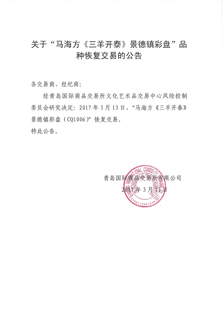 关于“马海方《三羊开泰》景德镇彩盘”品种恢复交易的公告