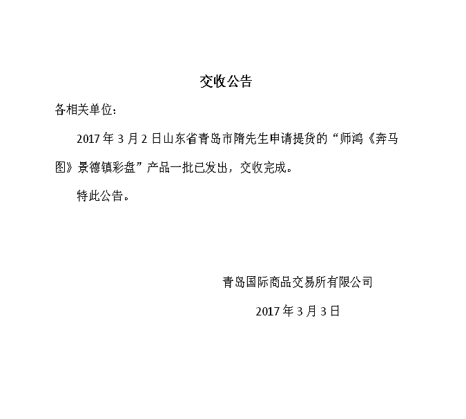2017年3月2日山东省青岛市隋先生申请提货的“师鸿《奔马图》景德镇彩盘”产品一批