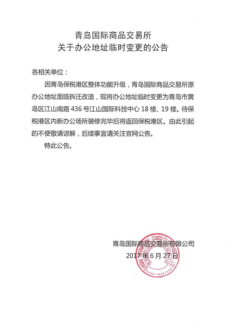 青岛国际商品交易所关于办公地址临时变更的公告