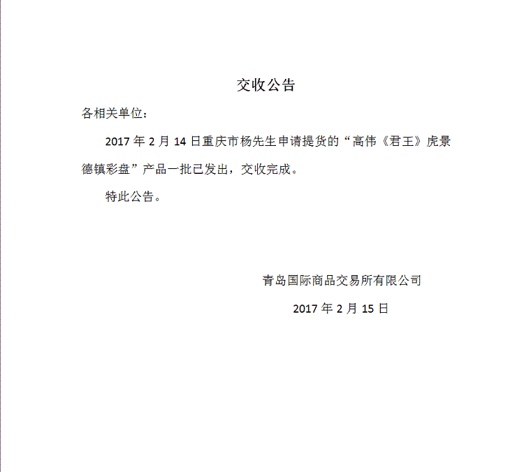 2017年2月14日重庆市杨先生申请提货“高伟《君王》虎景德镇彩盘”产品一批