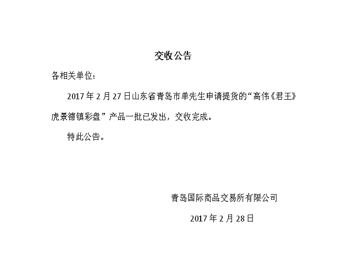 2017年2月27日山东省青岛市单先生申请提货的“高伟《君王》虎景德镇彩盘”产品一批