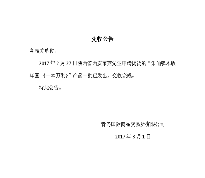 2017年2月27日陕西省西安市燕先生申请提货的“朱仙镇木版年画-《一本万利》”产品一批