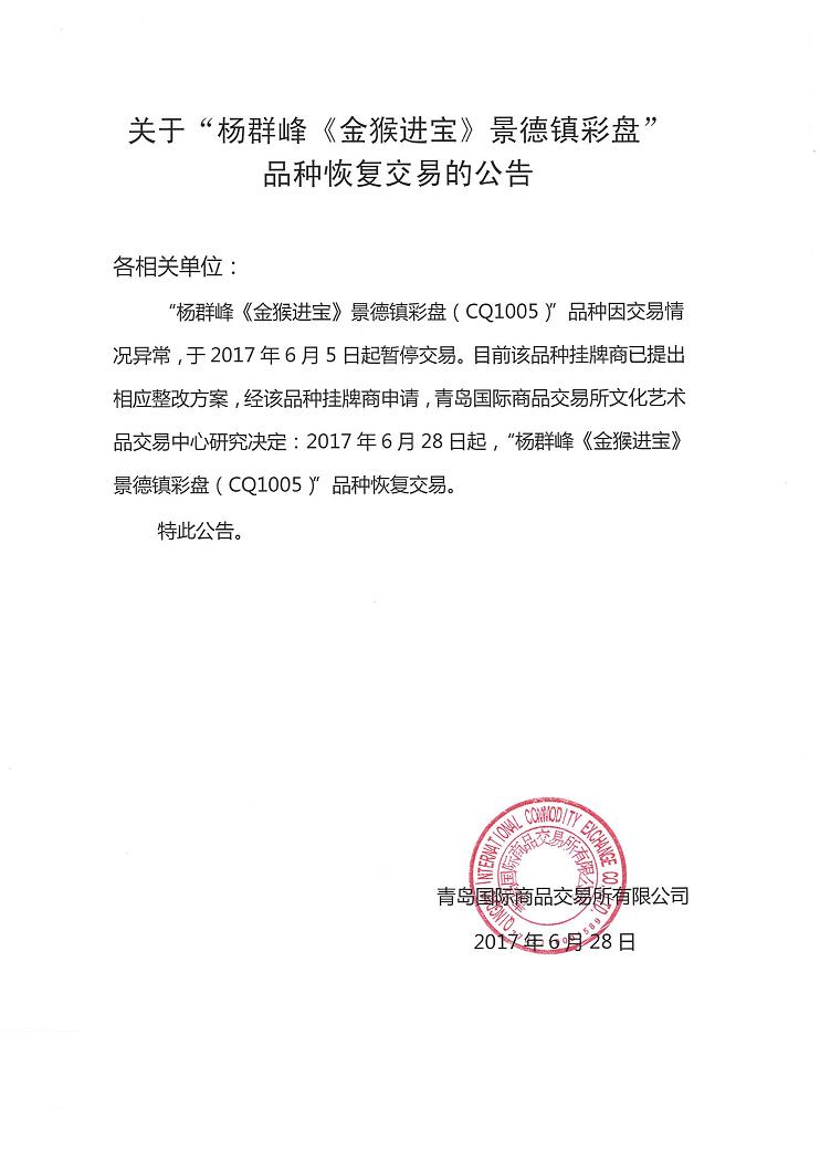 关于“杨群峰《金猴进宝》景德镇彩盘”品种恢复交易的公告