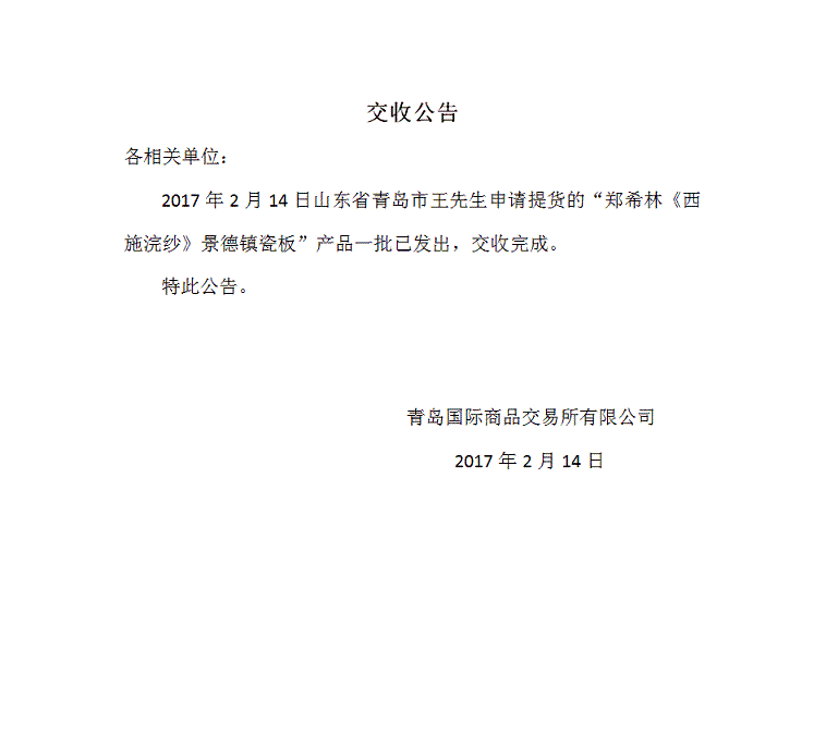 2017年2月14日山东省青岛市王先生申请提货“郑希林《西施浣纱》景德镇瓷板”产品一批