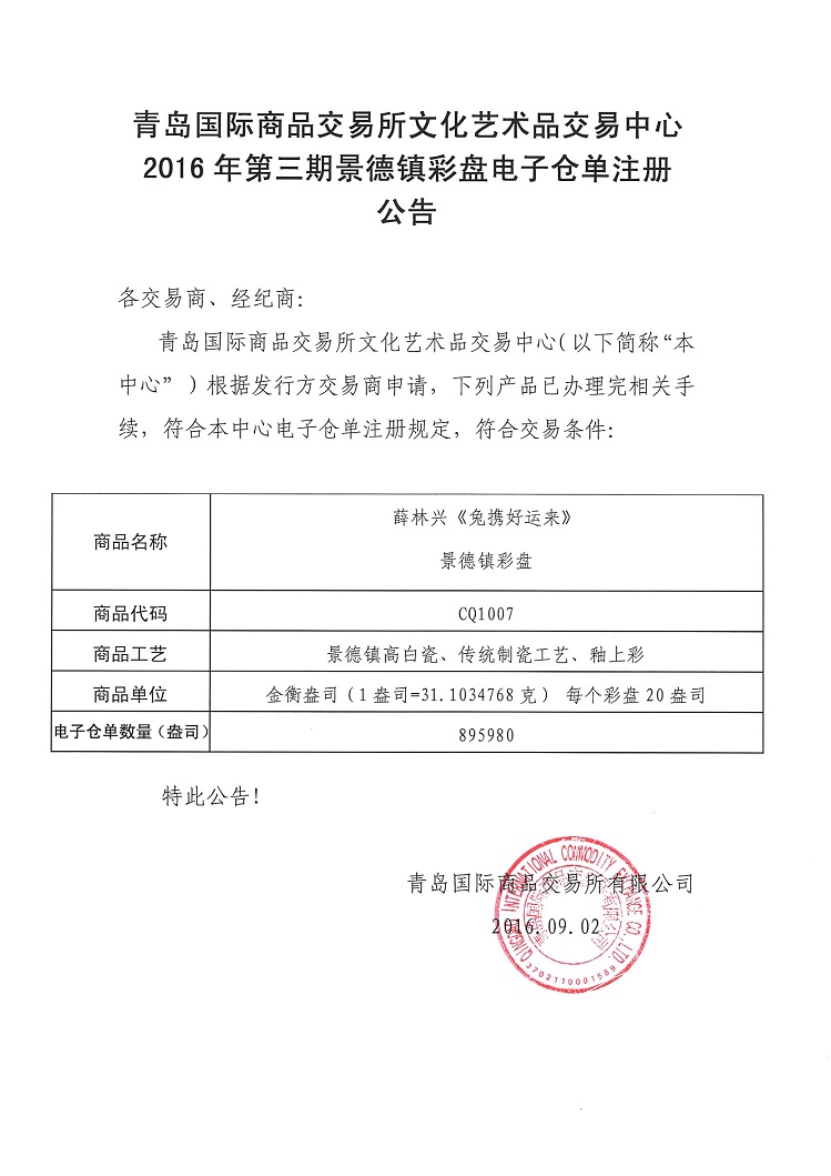 2016年第三期景德镇彩盘电子仓单注册公告