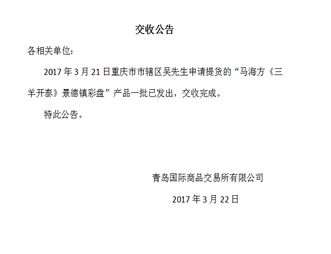 2017年3月21日重庆市市辖区吴先生申请提货的“马海方《三羊开泰》景德镇彩盘”产品一批