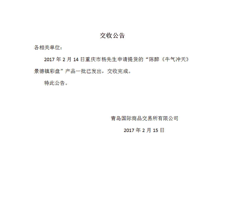 2017年2月14日重庆市杨先生申请提货“陈醉《牛气冲天》景德镇彩盘”产品一批