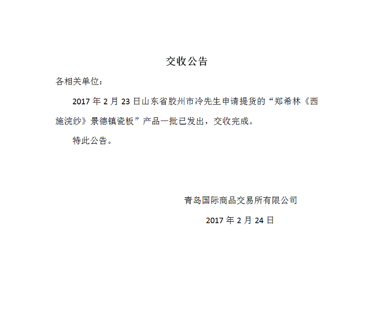 2017年2月23日山东省胶州市冷先生申请提货的“郑希林《西施浣纱》景德镇瓷板”产品一批