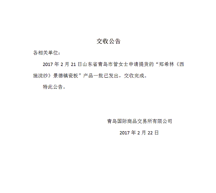 2017年2月21日山东省青岛市管女士申请提货的“郑希林《西施浣纱》景德镇瓷板”产品一批