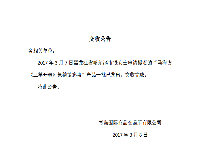 2017年3月7日黑龙江省哈尔滨市钱女士申请提货的“马海方《三羊开泰》景德镇彩盘”产品一批