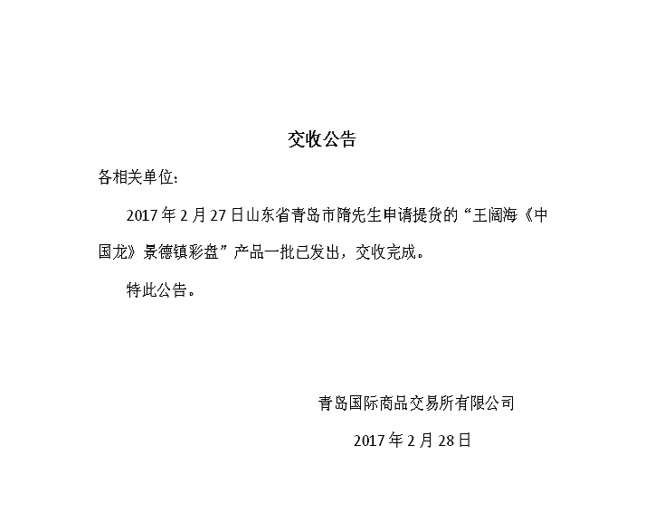 2017年2月27日山东省青岛市隋先生申请提货的“王阔海《中国龙》景德镇彩盘”产品一批
