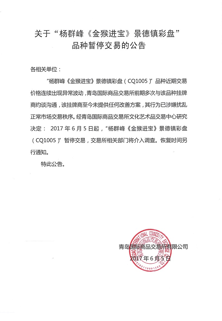关于“杨群峰《金猴进宝》景德镇彩盘” 品种暂停交易的公告