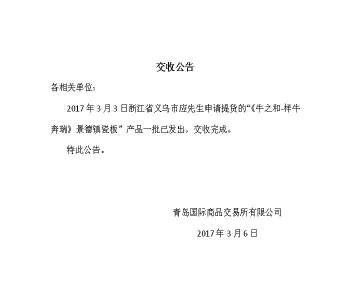 2017年3月3日浙江省义乌市应先生申请提货的“《牛之和-祥牛奔瑞》景德镇瓷板”产品一批