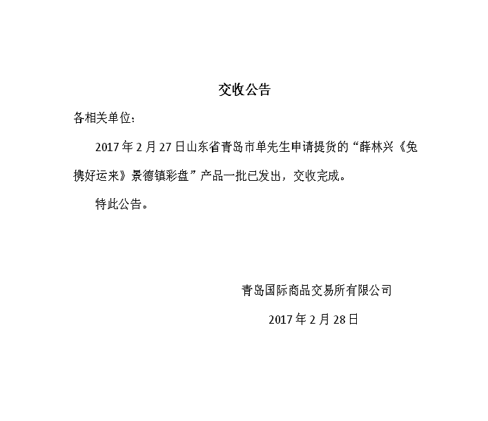 2017年2月27日山东省青岛市单先生申请提货的“薛林兴《兔携好运来》景德镇彩盘”产品一批