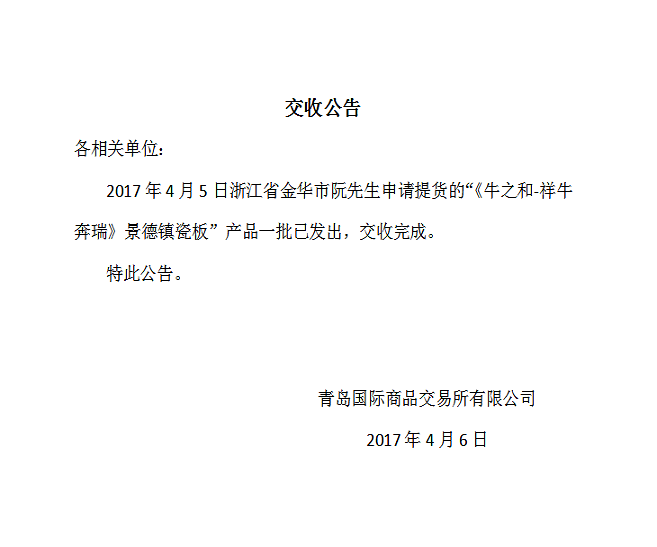 2017年4月5日浙江省金华市阮先生申请提货的“《牛之和-祥牛奔瑞》景德镇瓷板”产品一批
